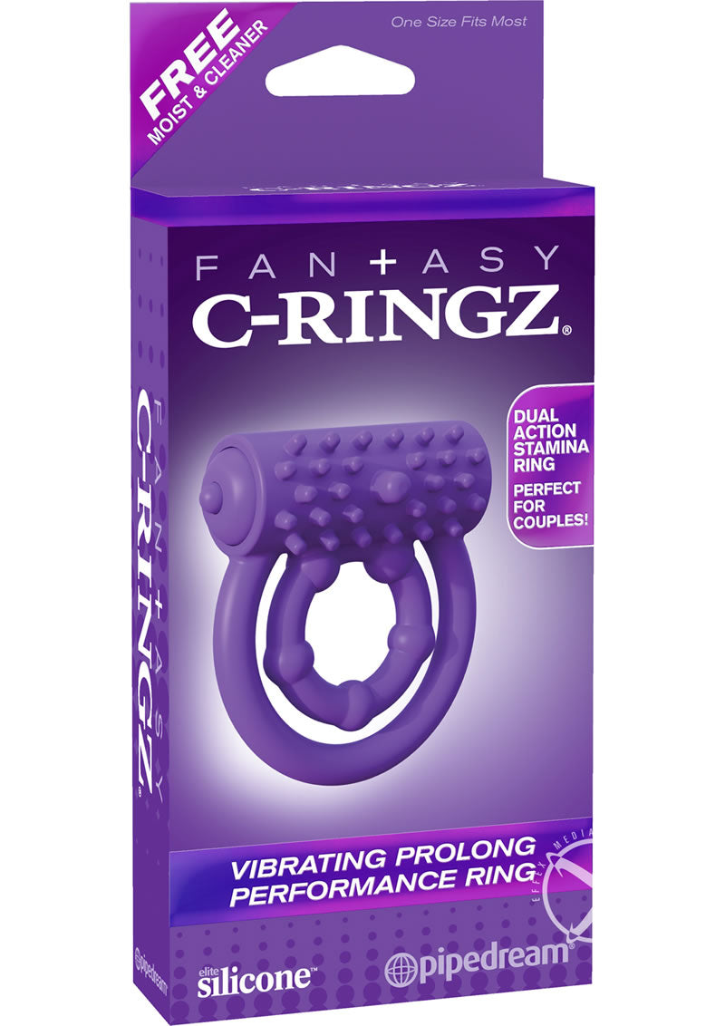 Perform like a pro, last longer than ever before, and extend the fun for both of you with the Vibrating Prolong Performance Ring. Made from body-safe, phthalate-free Elite Silicone, this dual-action stamina ring easily stretches for maximum comfort and proven results. The small ring wraps snug around your shaft while the large ring wraps around your penis and testicles. Try both rings pulled behind your whole package for an extra tight squeeze! The dual rings work together to gently put a clamp on performance letdowns and make you bigger, thicker, and harder than ever before!With the push of a button, turn on the waterproof bullet and you'll both be amazed! The powerful vibrations will tickle and tease her clit and send incredible pulsations through his shaft. Try it in the shower or hot tub and turn bath time into pleasure time. Cleanup is a snap after the fun with toy cleaner and warm water. Use plenty of Moist to ensure an extra wet and wild encounter!
